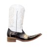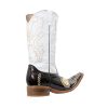 puntera larga, base negra con costura dorada y centenario, parte alta blanca costura dorada